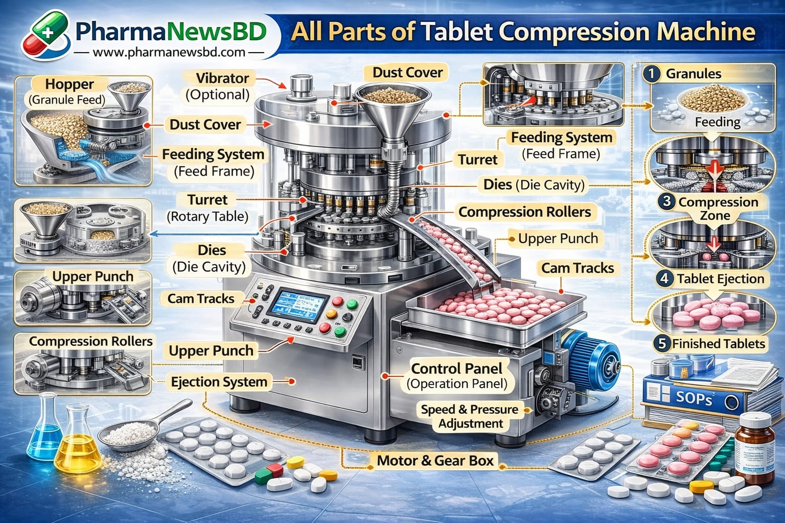 Tablet press is used for compressing granules to form tablet. Tablet line comprises with tablet press, deduster, dust collector, metal detector and vacuum transfer system. Tablet press also to be used for compression of slugs (without deduster & metal detector). Close system delivery of granules from IBC to the hopper of the Tablet compression machine. The design must meet all cGMP guidelines and legislation.