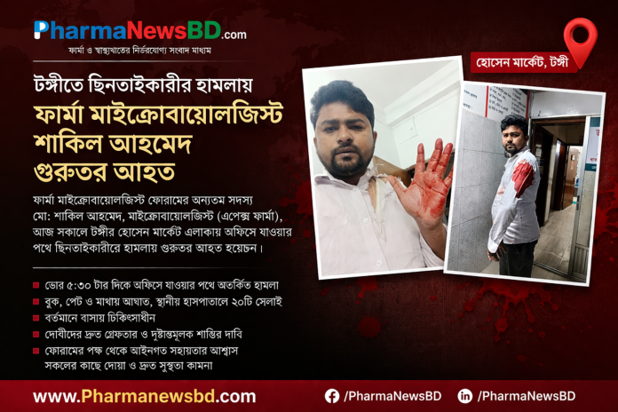 ফার্মা মাইক্রোবায়োলজিস্ট ফোরামের অন্যতম সদস্য মোঃ শাকিল আহমেদ, মাইক্রোবায়োলজিস্ট (এপেক্স ফার্মা), টঙ্গীর হোসেন মার্কেট এলাকায় ছিনতাইকারীদের হামলায় গুরুতর আহত হয়েছেন।
